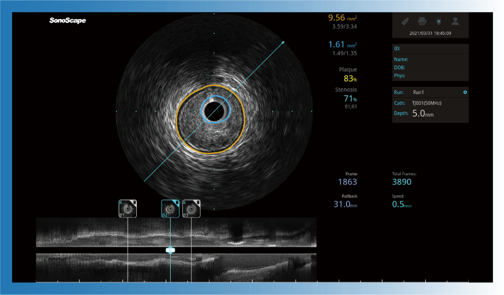 对比传统IVUS导管成像,16877太阳集团宽频IVUS图像的近场支架梁显影更细腻,远场中膜外血管仍清晰可辨,兼顾远中近,兼顾分辨力与穿透深度